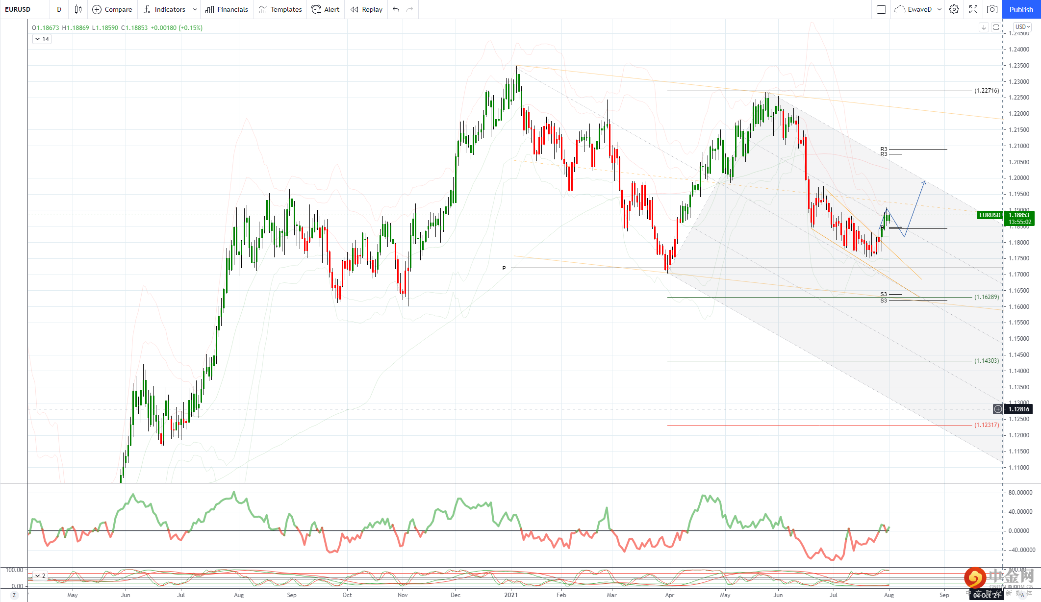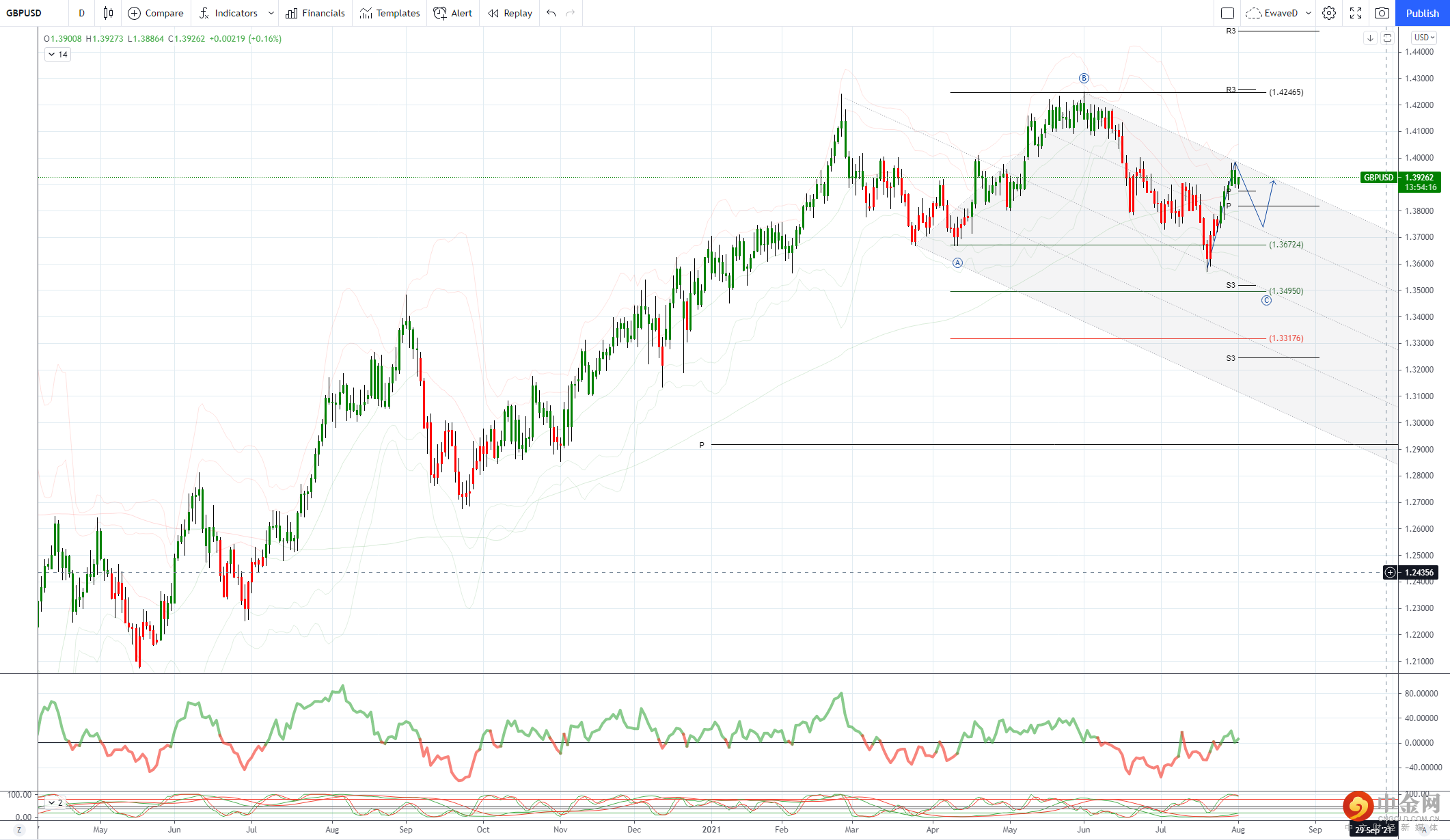 1.3981 上 21 天布林线和 1.3991 61.8% 目前 6 月 7 月下跌上限