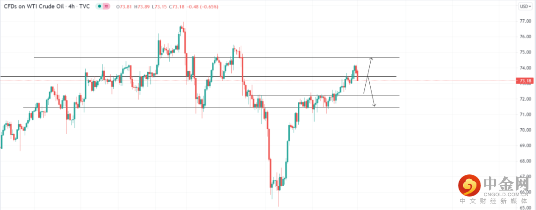 美元指数受提振,原油受提振,关注72.22的4小时支撑位置,回调收多可看多至74.65,止损71.83;关注73.45压力位,4小时受阻收空即可看空至71.44,止损73.78