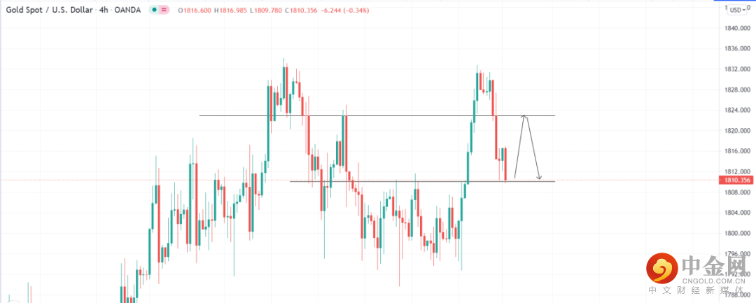 美元指数受支撑,黄金下跌,关注1810.05的支撑位,4小时回调收多即可看多至压力位1822.86位置,止损1807.76;关注1822.86压力位,4小时受阻收空即可看空至1810.05,止损1825.24