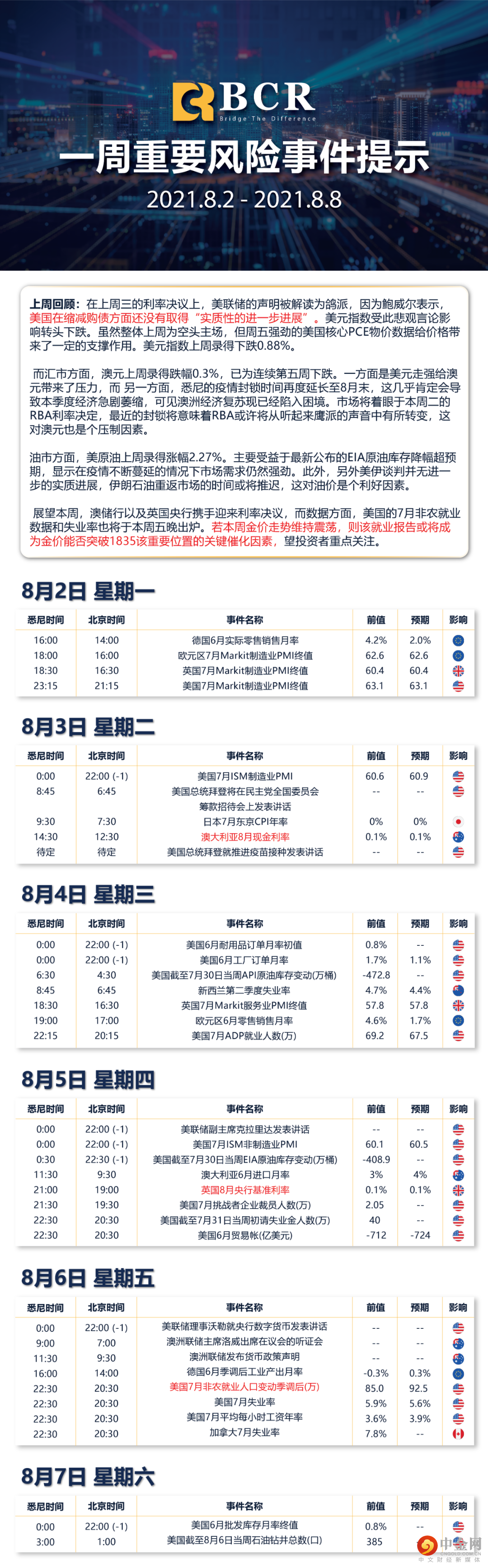 【BCR风险提示】一周重要风险事件提示 2021.8.2 - 2021.8.8