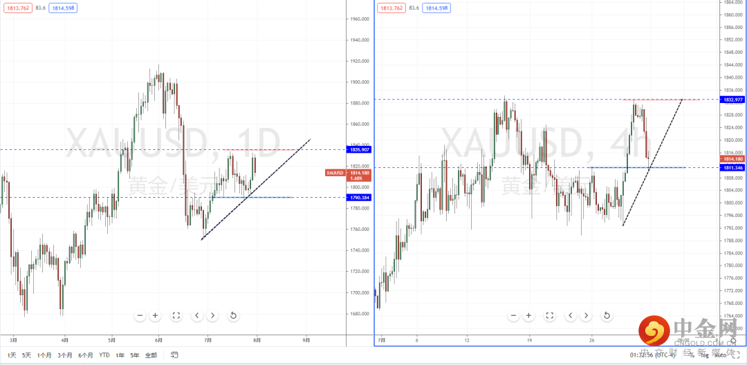 黄金天图:短期价格在冲击上方水平压制带1835.907附近继续受阻,但整体格局继续保持多头方向,下方有上升趋势线的支撑作用。从日内4小时级别,价格在支撑带1811.346附近有止跌迹象。可关注价格调整后起稳上行机会,上方目标位置参考1832.977附近。