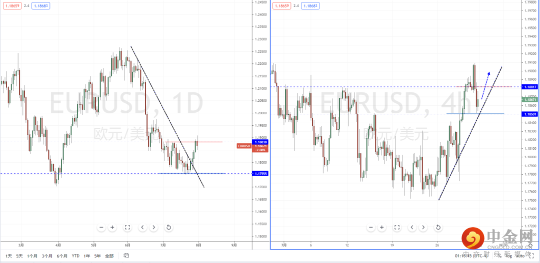 欧美天图:目前趋势虽然筑底成立后向上运行,但价格在冲击上方1.18838附近区域压制受阻,同时也因受到美元指数短期调整影响。欧美上行动能承压,从日内4小时级别,价格在冲高后回落至1.18817附近,并且测试下方支撑节点1.18501起稳。可适度关注价格调整后继续向上的多头机会,目标位置参考前期高点附近。