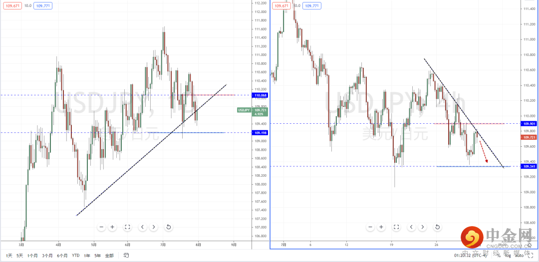 美日天图:短期趋势在上方水平压制带110.068附近承压后继续调整,虽然短期趋势有跌破上升趋势线的支撑作用,但下方有关键支撑带在109.198一带。从日内4小时级别,价格也在多重压制区域承压,可适当关注短线空头机会,下方目标位置参考109.341一带。