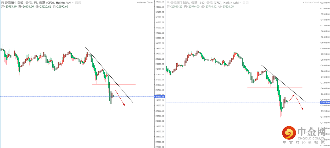 恒生指数天图:目前整体趋势继续处于在空头阶段,上方有下降趋势线的压制作用,水平压制带26850.77一带。从日内4小时级别,可适当关注价格调整后继续下行的空头机会,但需要注意下方空间幅度。如果破位将打开空头空间幅度,后市可能进一步走弱。