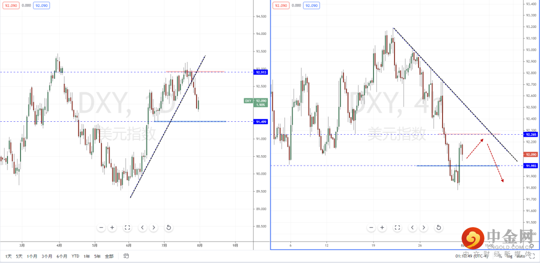 美元指数天图:目前整体趋势虽然处于在空头阶段中,但在趋势连续下行之后,短期价格也进入反弹阶段中。上方水平压制带在92.913附近,下方水平支撑带在91.499附近。从日内4小时级别,价格在跌破91.993附近后进入反弹。可适当关注价格回测上方压制带92.265附近受阻后的空头机会,下方目标位置参考前期低点附近。