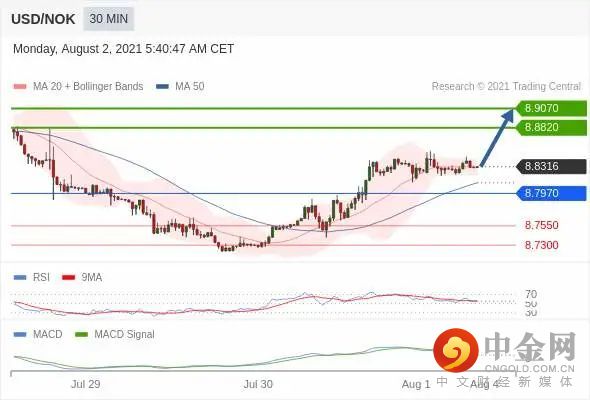 RSI 高于 50。MACD 低于其信号线且为正值。该货币对可能会回撤。此外,价格高于其 20 和 50 周期移动平均线(分别位于 8.8309 和 8.8108)。