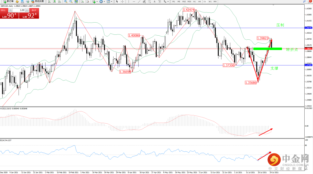 低位多头动力强势反转上移,触及布林带指标上轨附近节点1.39821位置遇阻回撤,布林带指标呈张口走势持续中,短期多头动力开始减弱,上方压制关注1.40776附近,低位支撑关注1.37300附近,关注1.38831附近转折点,MACD指标处于空头区域低位持续震荡上移至0轴线附近徘徊,RSI指标低位多头动力持续震荡上移至50均衡线上方震荡中,如图: