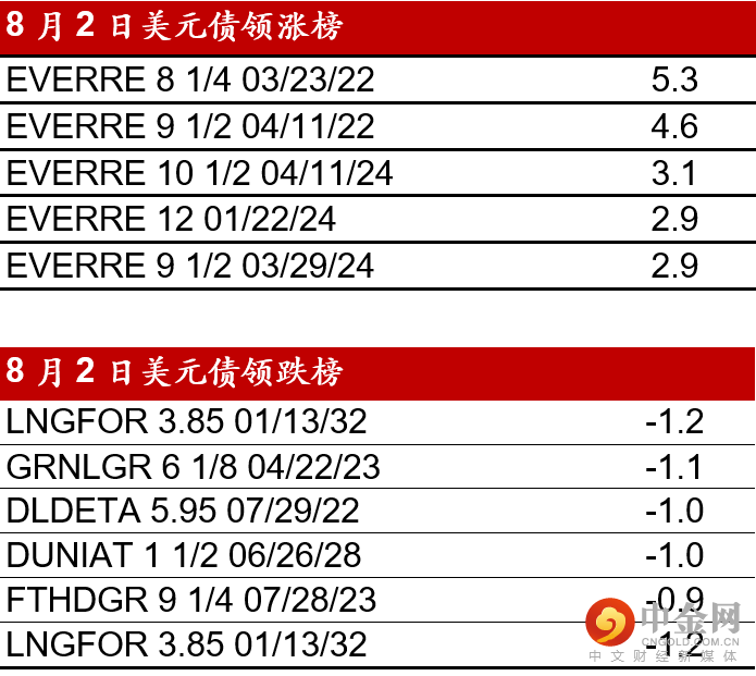 昨日(8月2日)中国高收益债市场在一周的抛售后得到喘息,恒大在出售恒腾网络股份及深圳市高新投集团后领涨,整条曲线约上涨2.5-5pts;稳健的市场情绪同样扩散至其他高流动性债券,佳兆业和融创收涨1-3pts,其他B评级债券亦在市场上有较多买盘,中梁约涨0.5-1.5pt,正荣涨0.5pt左右。流动性较低的债券如景瑞和德信也上涨约0.25pt。非房地产板块(如西部水泥和宏桥)基本持平或稍微收涨0.5pt。