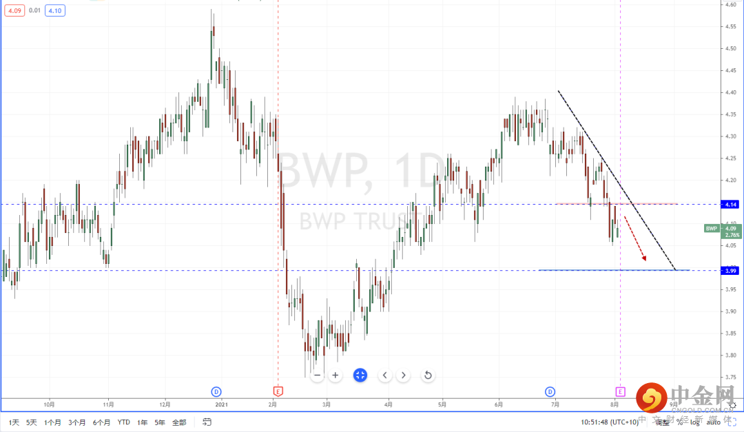 BWP:由于目前市场环境依旧疲软,并且再度受到疫情的影响,从整体ETF产业产业继续趋于走平。从BWP整体趋势也处于在空头阶段中,上方有下降趋势线的压制作用,其水平压制带在4.14附近。短期可适当关注价格调整后继续走弱的空头机会,下方目标位置参考3.99附近。