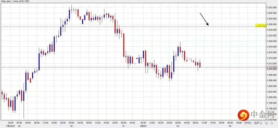 这个星期市场焦点落在7月份ADP私人机构新增职位数据,以及7月份非农就业人数数据上,到目前为止,两者数据平均预期皆比上次为好,若以数据逻辑作推断,数据越好反映出美国经济后市展望趋向乐观,买入黄金避险的需求会减少,对金价应该会构成压力。故此,金价在短期间未必能够得轻易突破$1,830美元的障碍,可以部署在该高位水平附近看淡金价向下整固。