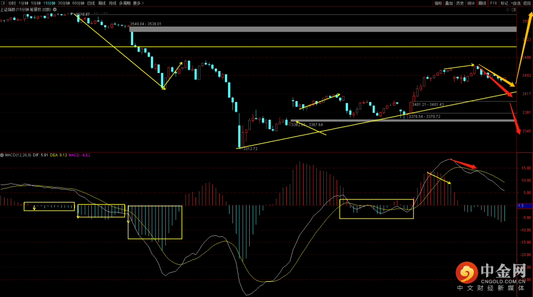 大盘短期继五分钟背驰后出现了十五分钟背驰结构,短期还是依旧出现缩量新高,在前期这种情况大多是出调整的概率偏大,关注十五分钟的上升趋势线是否跌破,而如果没有跌破这边想要脱离震荡区要到达3526才能成功,否则大概率还会再次回落。