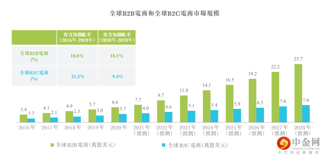 随着电子信息技术的进一步发展与全球经济趋向一体化,电子商务在国际贸易中的影响力和关键程度都有所提高。2020年全球的生活或工作模式都有着巨大变化,从实体逐渐改变成线上进行,网购生活需求激增,甚至在去年疫情期间成为经济奇葩。根据艾瑞咨询报告,2020年全球B2B电商市场规模约为6.6万亿美元,预计2028年将会达到25.7万亿美元,复合增长率为18.5%。至于B2C市场,2020年的市场规模约为3.7万亿美元,预计2028年将会达到7.6万亿美元,复合增长率为9.4%。