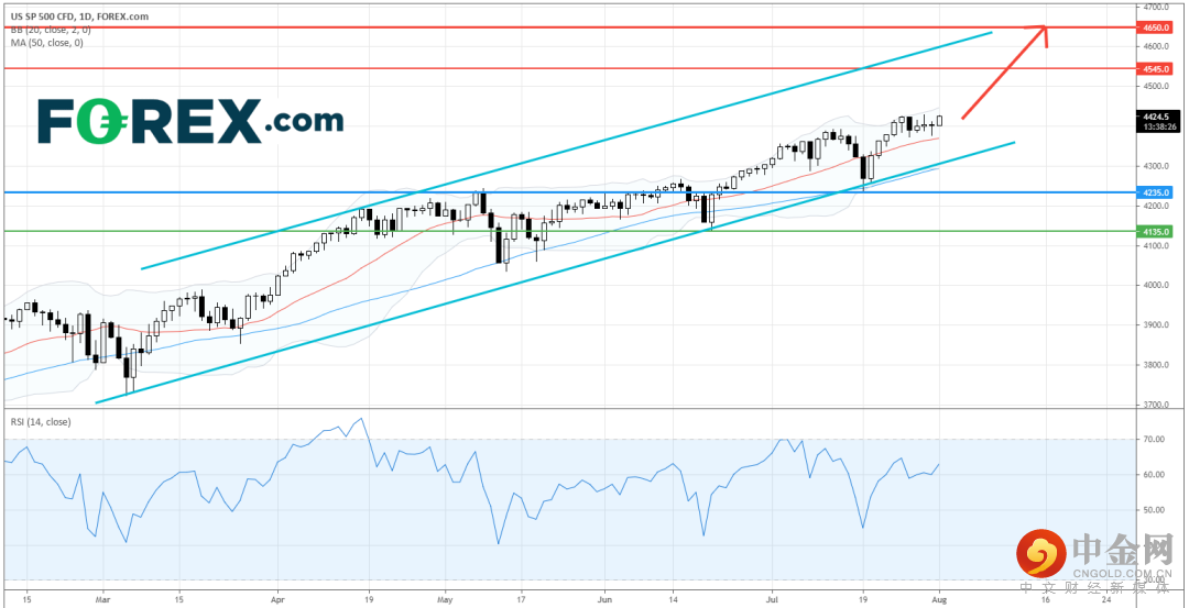 技术配置表示看涨走势不变,上行目标则在4,545点和4,650点。看涨投资者可将主要支持 (止损) 位设在4,235点。