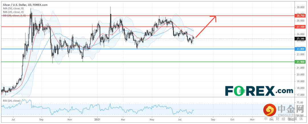 看涨的投资者可将每盎司23.80美元视为主要支撑,上行目标在27.10美元及28.75美元。