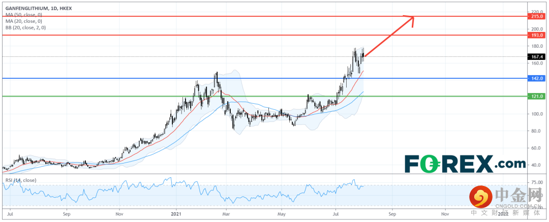 在日线图上,赣锋锂业的涨势超出我们6月时预测的目标,目前技术走势依然强劲。它在20日及50日移动线上方交投,相对强弱指标未出现看跌背离。