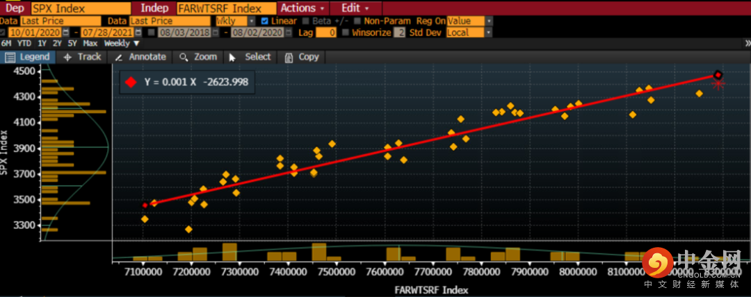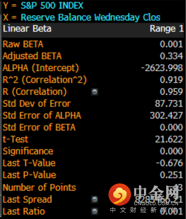 2020年10月以来的标普500指数与美联储资产负债表线性回归数据(上表)和统计数据(下表)