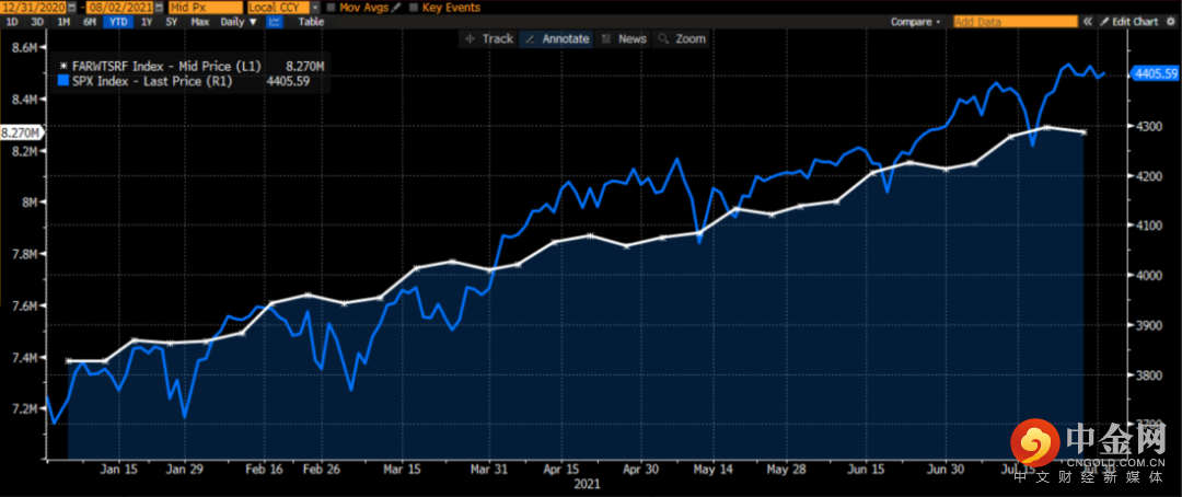 年初至今美联储资产负债表(白色)与标普500指数(SPX,蓝色)