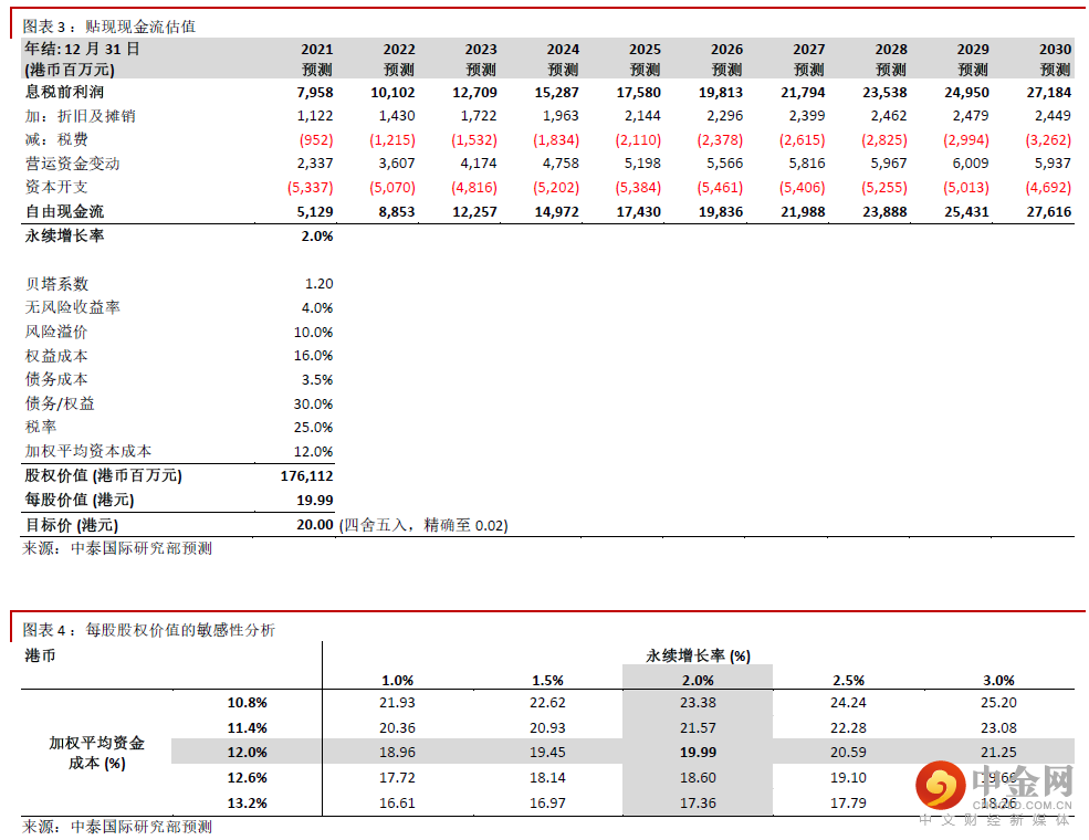 我们相应将贴现现金流(DCF)分析推算的目标价由17.00港元调升17.6%至20.00港元(见图表3-4),这对应22.7倍2022年市盈率和22.9%上升空间。我们重申“买入” 评级。