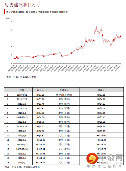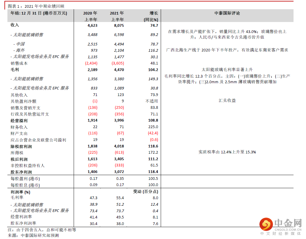 公司昨日公布理想的2021年中期业绩,股东净利润同比上涨118.4%至30.7亿元港币(同下),接近公司盈喜预测增长120.0% 上限(见图表1),主因:(一)在需求增长及产能扩张下,光伏玻璃销量同比上升43.0%;(二)光伏玻璃价格上升提升收入及毛利率。今年上半年3.2mm光伏玻璃市场均价同比增长约14%。公司总毛利率则同比增长8.0个百分点至55.4%;(三)广西北海光伏玻璃生产线于2020年下半年投产,有效满足东南亚客户需求;(四)人民币及马来西亚令吉兑港币皆升值。