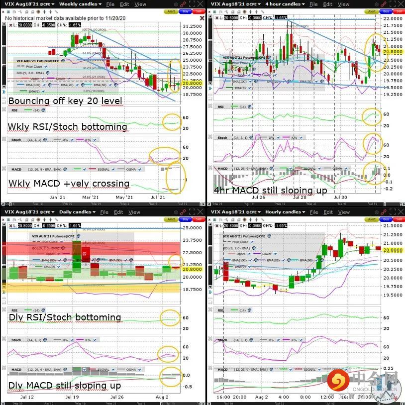 值得注意的是,波动率指数期货在过去一个月的大部分时间里一直维持在关键整数心理点位20以上,在下周初测试周线图上的下行通道阻力线的可能性颇高,正如在7月份一度向上突破该阻力线所预示的那样。