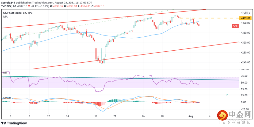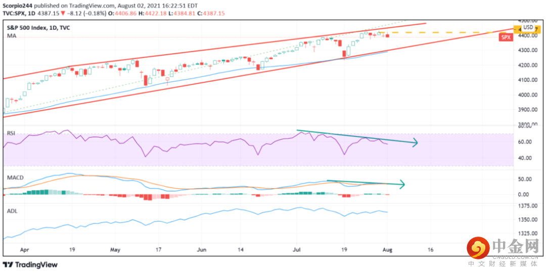 标普500指数仍有一个倾斜向下的相对强弱指数RSI,MACD和腾落指数线。另外,标普500指数似乎想下滑向4330附近的趋势线。