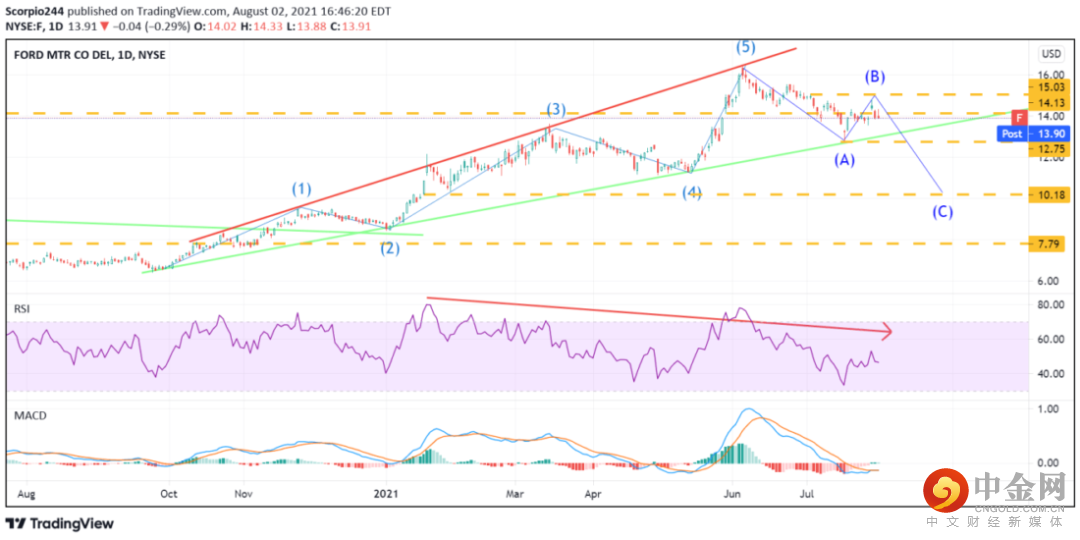 福特公司的股票以及回吐了全部在财报公布后的涨幅,其图表上有明显的下降趋势,其支撑线位于12.75美元附近。