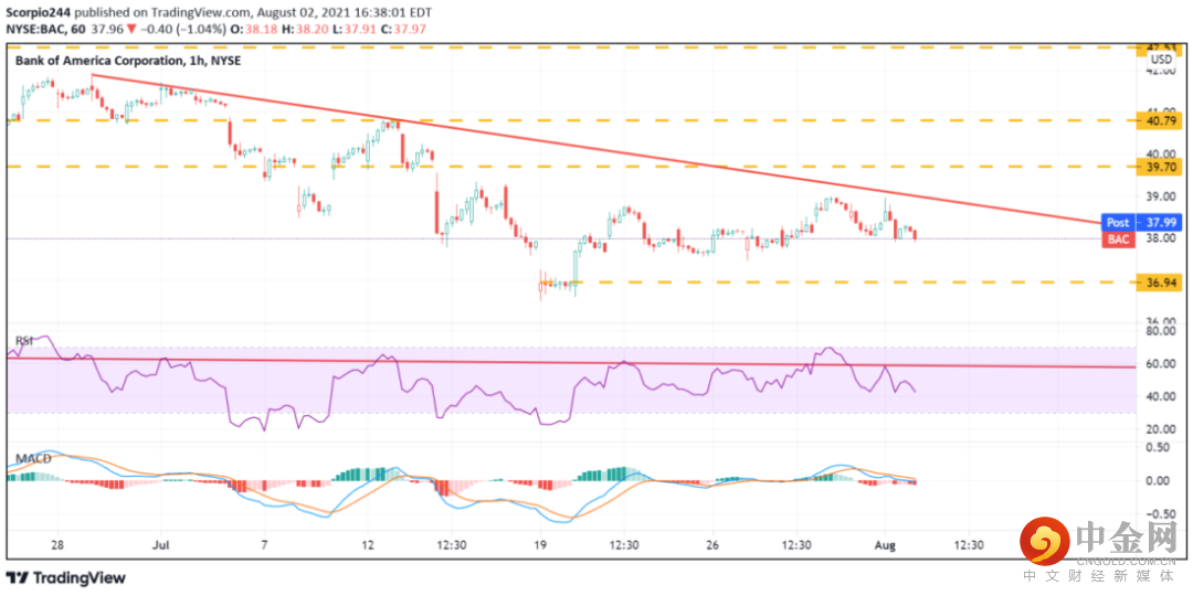 考虑到国债收益率下滑和价差收窄的情况,美国银行股票看起来疲弱。不过,37美元可能是美国银行股票可能止跌的地方。