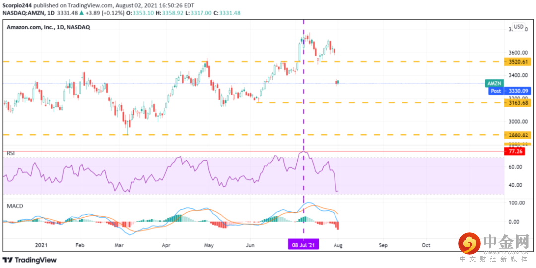 这可能对接下来的走势没有很好的指向作用。鉴于亚马逊给出的较低盈利指引,看起来该公司的股价可能走低,下一个支撑线位于3160美元。