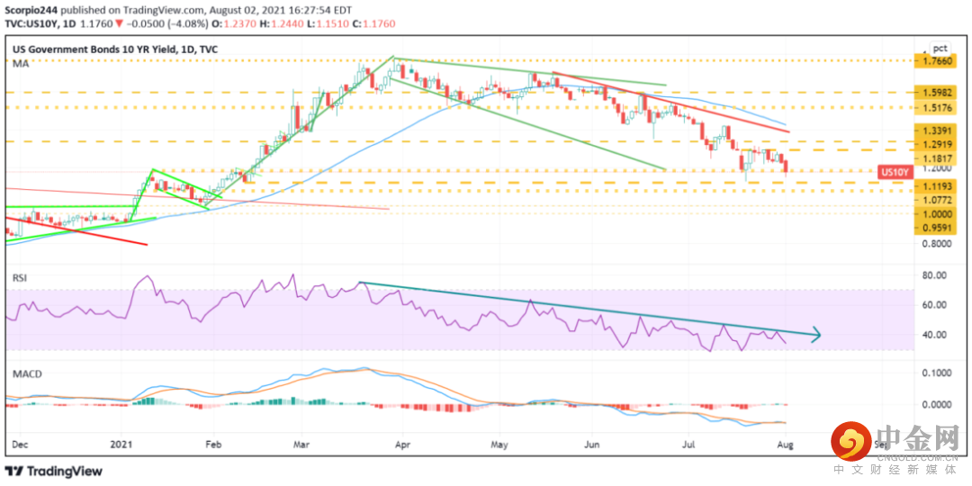 观察10年期美国国债的走势,其收益率仍未见底,仍有进一步下滑的空间。