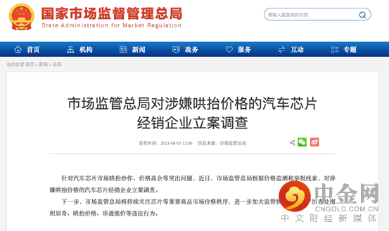 8月3日,国家市场监管总局发布通知称,针对汽车芯片市场哄抬炒作、价格高企等突出问题,近日,市场监管总局根据价格监测和举报线索,对涉嫌哄抬价格的汽车芯片经销企业立案调查。