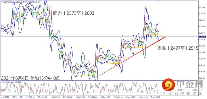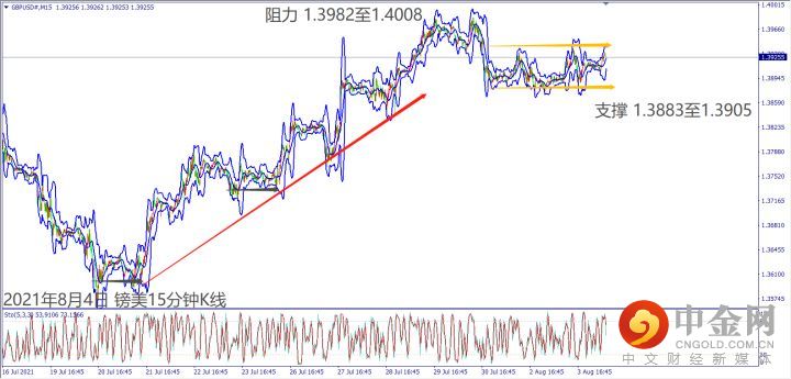 日级别线图,短线在1.3900关口附近震荡,一旦突破60日均线,有望再创波段新高;15分钟K线,盘涨后高档进行整理,盘整顶部若刺破,有机会挑战前高阻力。