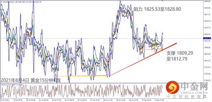 日级别线图,短线在1810美元附近筑底,一旦突破5日均线,有望冲刺1830美元;15分钟K线,维持盘涨走势,守住1810美元,有机会挑战前高阻力。