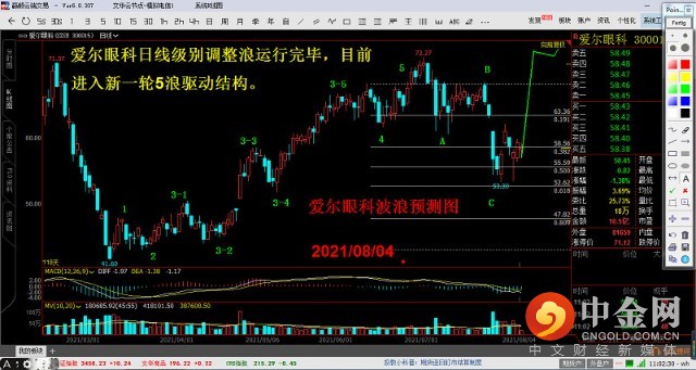 爱尔眼科波浪预测图。爱尔眼科日线级别调整浪运行完毕,目前进入新一轮5浪驱动结构。