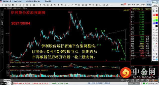 伊利股份波浪预测图。伊利股份运行普通平台型调整浪,目前处于C-4与C-5转换节点,短期内后市再破新低后将开启新一轮上涨走势。