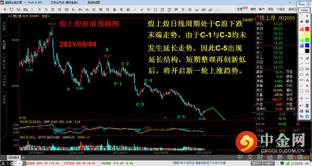 煌上煌波浪预测图。煌上煌日线周期处于C浪下跌末端走势,由于C-1与C-3均未发生延长走势,因此C-5出现延长结构,短期整理再创新低后,将开启新一轮上涨趋势。