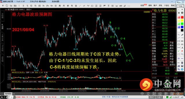 格力电器波浪预测图。格力电器日线周期处于C浪下跌走势,由于C-1与C-3均未发生延长,因此C-5将再度延续深幅下跌。