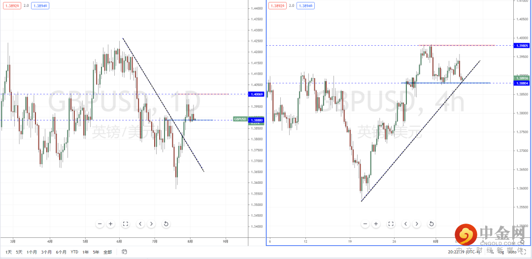 镑美天图:目前行情继续在关键支撑区间附近徘徊,下方水平支撑带在1.38880附近,上方水平压制带在1.40069附近。虽然整体趋势格局趋于偏多,从日内4小时级别,趋势上行动能不足,并且形成窄幅区间调整。近期可关注价格有效测试下方支撑后再次起稳的多头机会,上方目标位置参考前期高点附近。