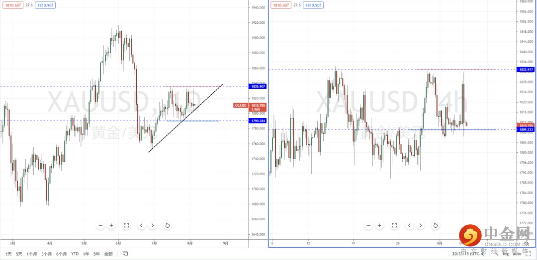 黄金天图:目前行情虽然在上升趋势线之上运行,趋于偏多。但从近期价格的走势表现相对比较极端,价格在冲击上方水平压制带1815.907附近受阻回落。从日内4小时级别,价格表现比较极端。短期可关注价格测试下方支撑带的表现,如果破位将可能转势为空。