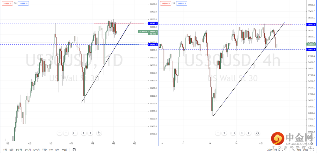道琼斯指数:目前趋势在上方压制带35097.2附近继续承压受阻,并且价格偏离上升趋势较远,有可能继续下行测试关键支撑附近。从日内4小时级别,价格在短期跌破上升趋势线后在下方水平支撑带34803.2附近起稳,但需要进一步测试其支撑的有效性。如果起稳可适当关注短线多头机会,目标位置参考前期高点附近。