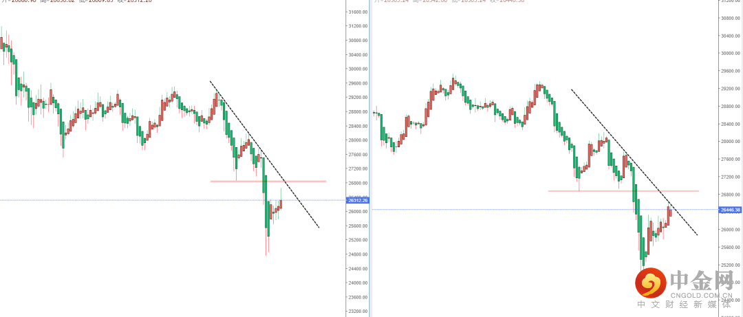 恒生指数天图:短期价格继续上行反弹,但整体趋势依然处于在空头阶段,上方水平压制带26846.62附近。从日内4小时级别,价格也正处于冲击下降趋势附近,可适当关注价格在此区间的表现。如果突破上行将继续反弹,反之,则可能继续承压走弱。