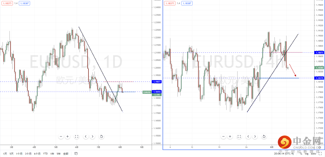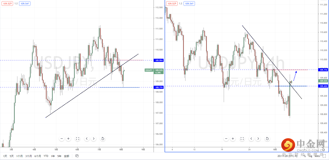 美日天图:目前趋势在极端测试下方水平支撑支撑带108.715附近后,极端上行反弹。虽然整体格局处于在偏空阶段中,但从日内4小时级别,由于价格反弹力度较大,其趋势也有效站上水平压制带109.420附近以及下降趋势线的压制作用。可适当关注价格调整反弹多机会,上方目标位置参考109.776一带。
