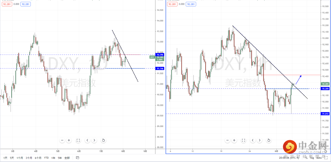 美元指数天图: 短期价格在下方水平支撑带91.746附近调整纠结后,止跌向上运行,并且正冲击上方下降趋势线附近。从日内4小时级别,价格已经有效突破水平支撑带92.209一带以及下降趋势线的压制作用。如果其趋势进一步向上将可能转势为多。可关注价格进一步确认后上行的多头机会,上方目标位置参考92.419一带。