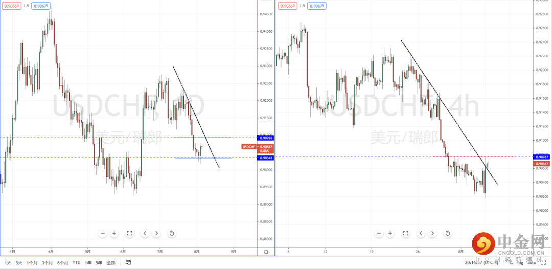 美瑞天图:短期趋势在近期美元指数影响下,也在测试前期水平支撑带0.90343附近起稳止跌。虽然整体趋势依然处于在空头方向,上方又有下降趋势线的压制作用。从日内4小时级别,价格也在关键压制带附近徘徊。如果突破上行将可能继续向上反弹,短期目标位置参考0.90926一带。