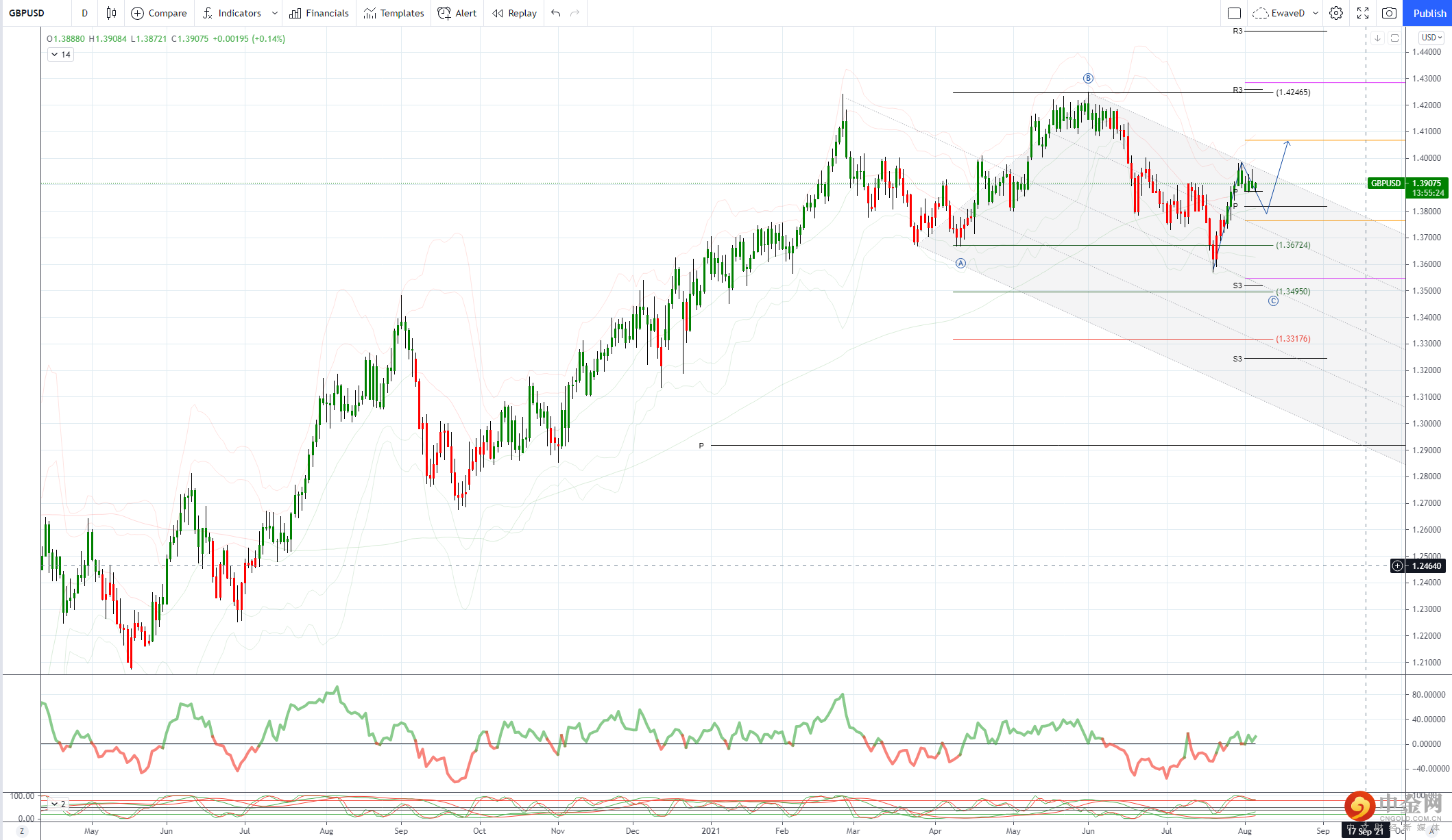 1.3991 61.8% 6-7 月下跌和 1.4000 上方 21 天布林线关键