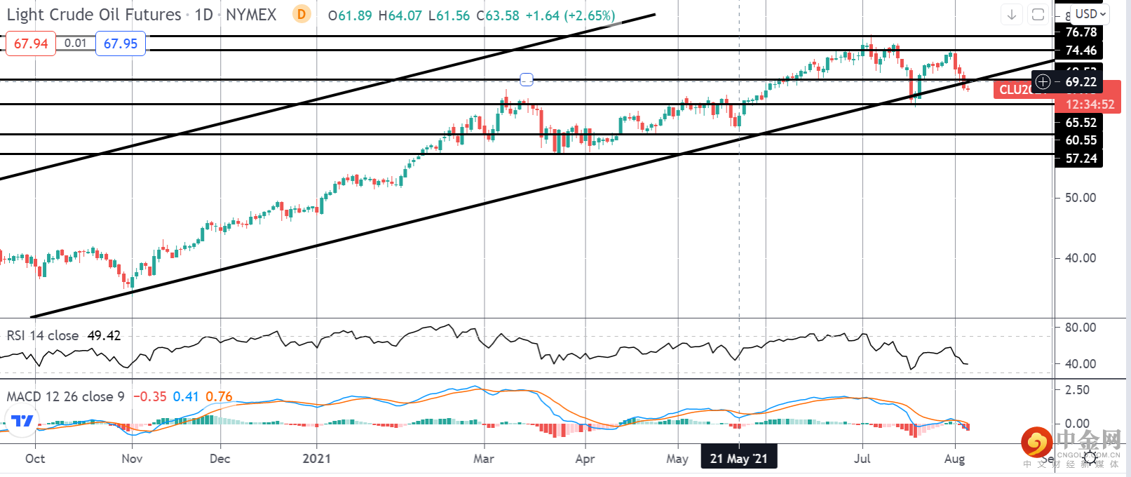 最近在 74.46 水平的失败现在有可能在 76.78 水平高点上创造一个较低的峰值。由于价格现在挑战上升通道的低点,如果价格突破 65.52 的水平低点,短期内有更深反转的风险,接下来将焦点转向 60.55,与看跌的 MACD 和 RSI 读数一致。