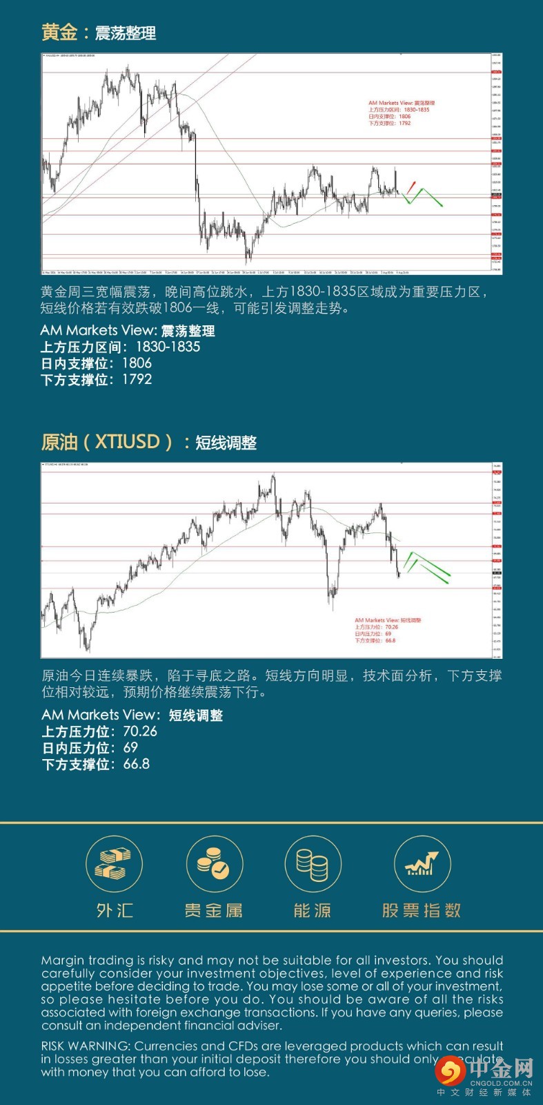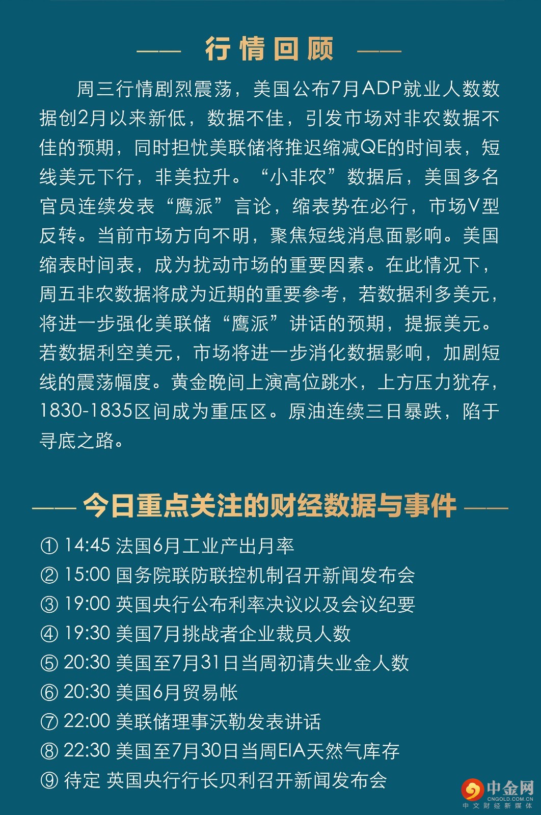 周三行情剧烈震荡,美国公布7月ADP就业人数数据创2月以来新低,数据不佳,引发市场对非农数据不佳的预期,同时担忧美联储将推迟缩减QE的时间表,短线美元下行,非美拉升。“小非农”数据后,美国多名官员连续发表“鹰派”言论,缩表势在必行,市场V型反转。当前市场方向不明,聚焦短线消息面影响。美国缩表时间表,成为扰动市场的重要因素。在此情况下,周五非农数据将成为近期的重要参考,若数据利多美元,将进一步强化美联储“鹰派”讲话的预期,提振美元。若数据利空美元,市场将进一步消化数据影响,加剧短线的震荡幅度。黄金晚间上演高位跳水,上方压力犹存,1830-1835区间成为重压区。原油连续三日暴跌,陷于寻底之路。