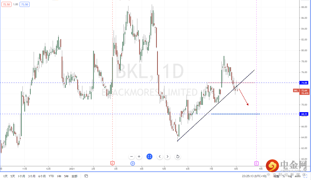 BKL:从短期市场环境的状态,好坏互转。虽然有较好数据刺激作用,但从产业的表现与个股走势依然偏弱。从BKL目前整体格局在持续下行后跌破水平支撑带在74.08附近,同时也跌破上升趋势线的支撑作用。空头格局已经成立,短期可适当关注价格调整后继续走弱的空头机会,下方区间目标位置参考68.31一带。