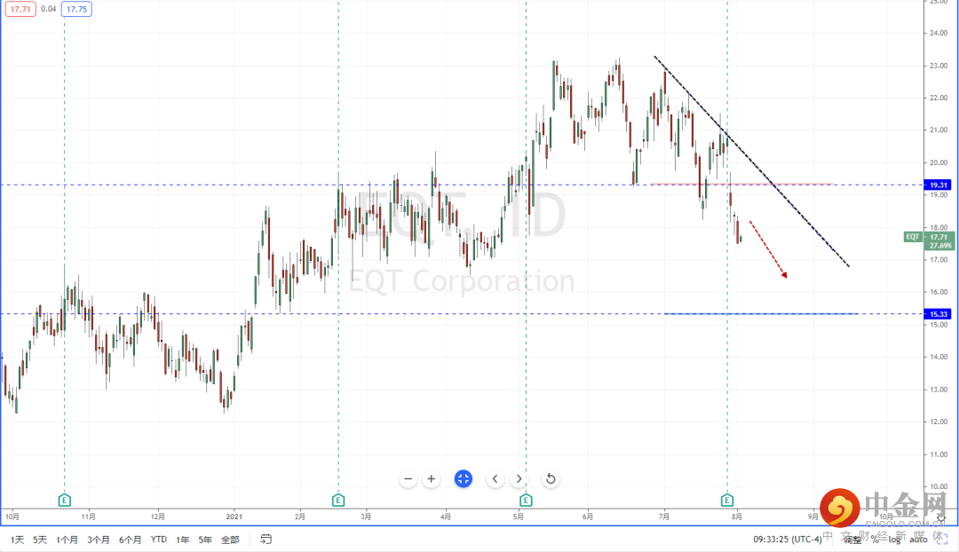 EQT:从目前整体格局继续破位下行,由于ETF能源产业持续在弱势阶段运行,导致其相关性个股持续走弱。从EOG现阶段走势表现,已经坚决跌破水平支撑带19.31附近。空头流向明确,短期可适当关注价格调整后继续下行的空头机会,下方区间目标位置参考15.33附近。