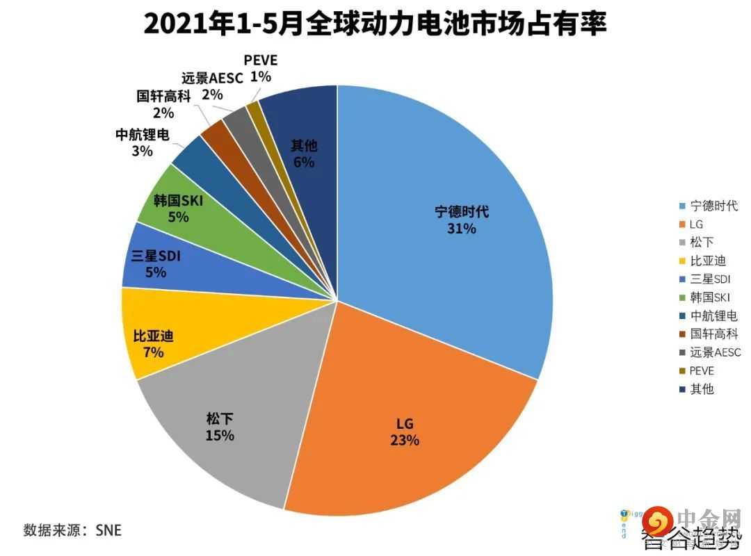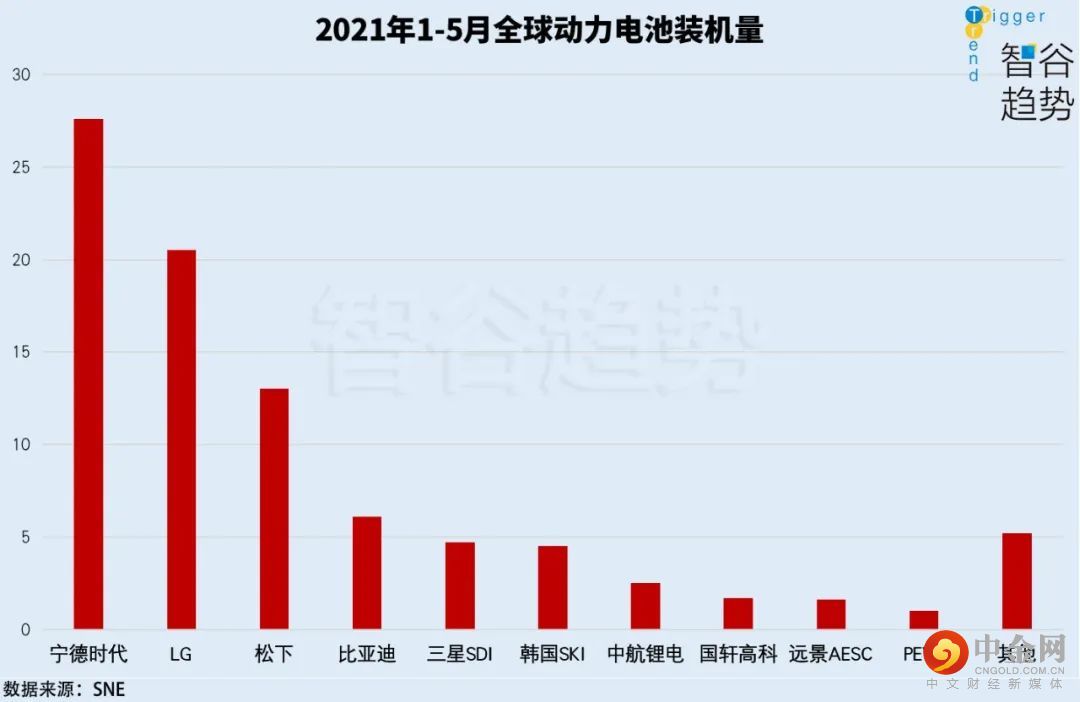 2021年1-5月,动力电池的装车量达到88.4GWh(百万千瓦时),同比上升了223.9%。行业前10的龙头中,中国占到5家,韩国3家,日本2家。