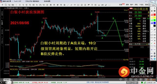 白银小时波浪预测图。白银小时周期趋于A浪末端,10分级别背离迹象明显,短期内将开启B浪反弹走势。